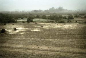 But these are sands of the Middle East where wars took place and are still taking place, and people died and are still dying. Original images were gruesome and war-torn. Azar has sanitized the images by erasing the corpses — but tank tracks and other human traces hauntingly remain.