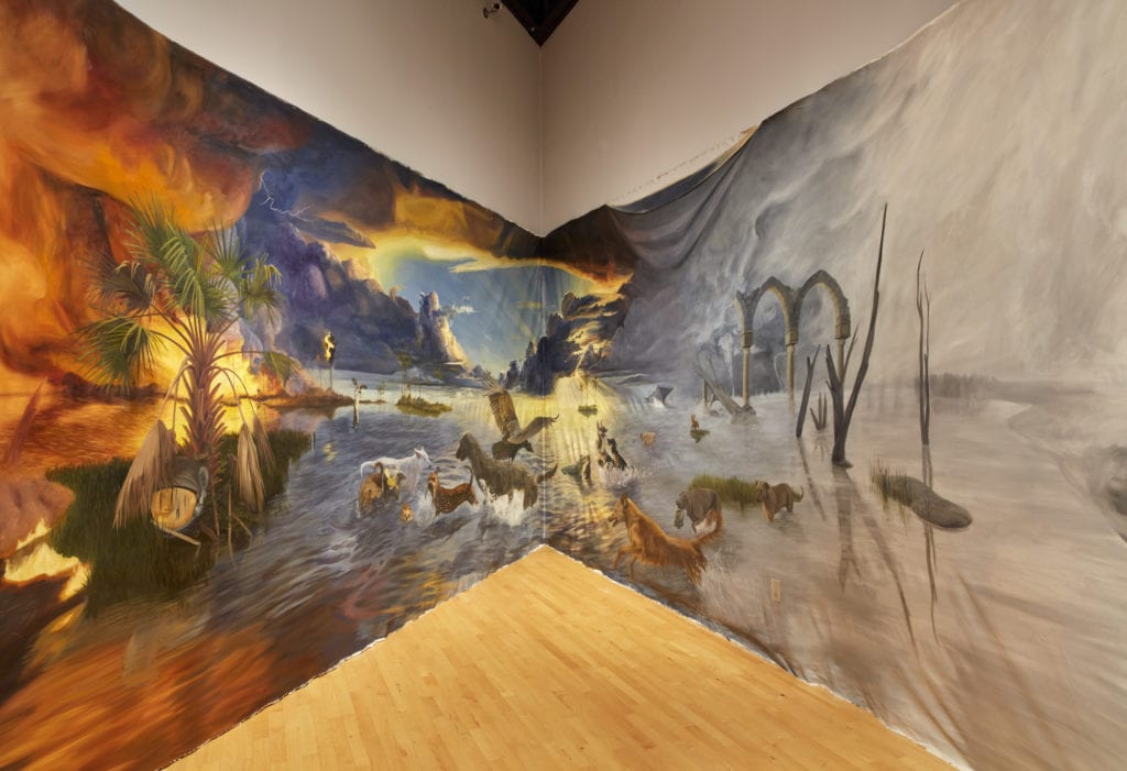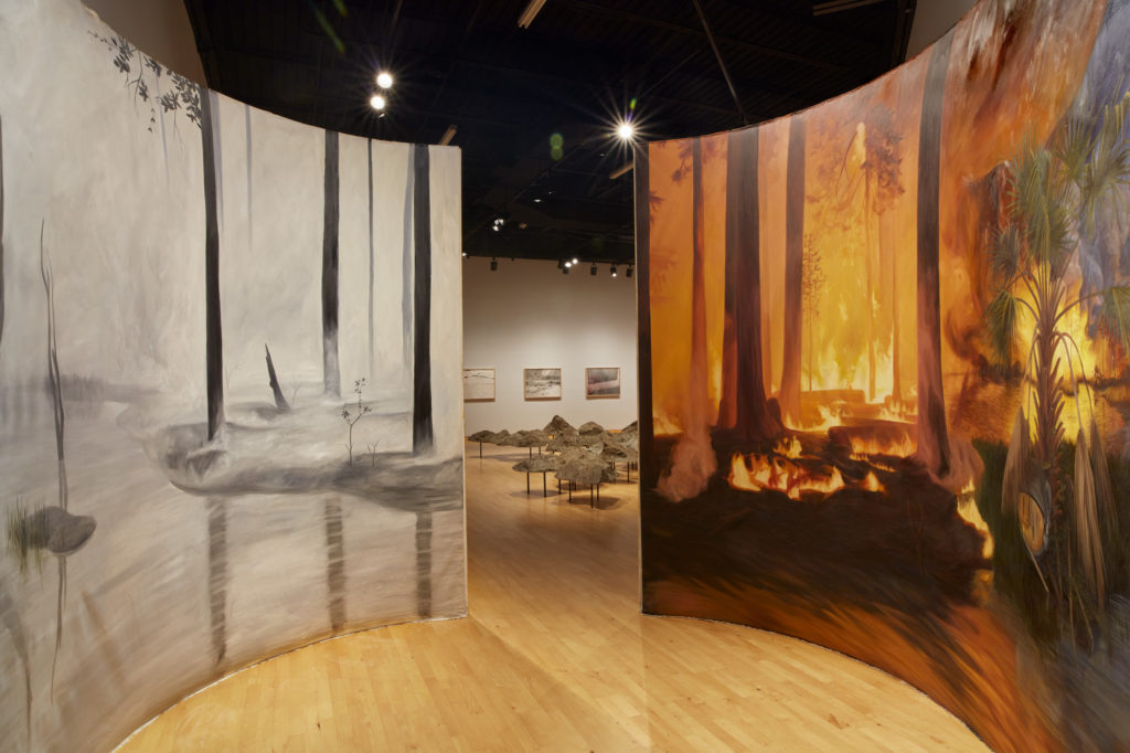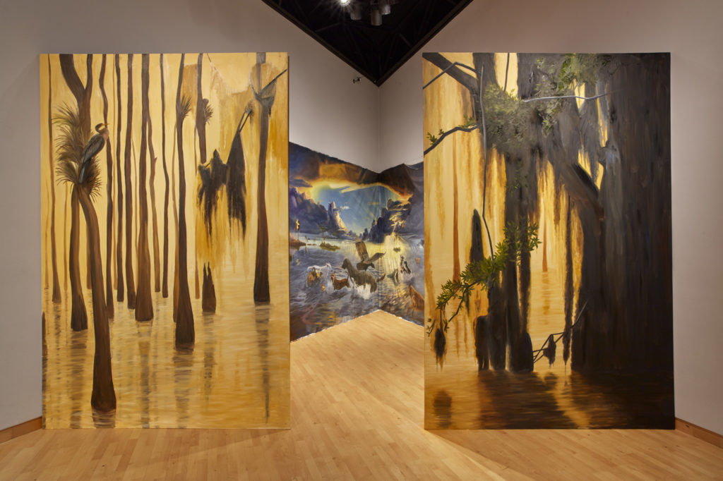 It’s a very Florida scene, reminiscent of the Highwaymen painters. The entrance is through a diptych painting of cypress swamps — with a panoramic view of the ten-foot tall by 50-foot long painting. In the apex of the 45-degree corner is the iconic Florida sunset, or it could be sunrise, with dogs and wildlife and an aircraft carrier.