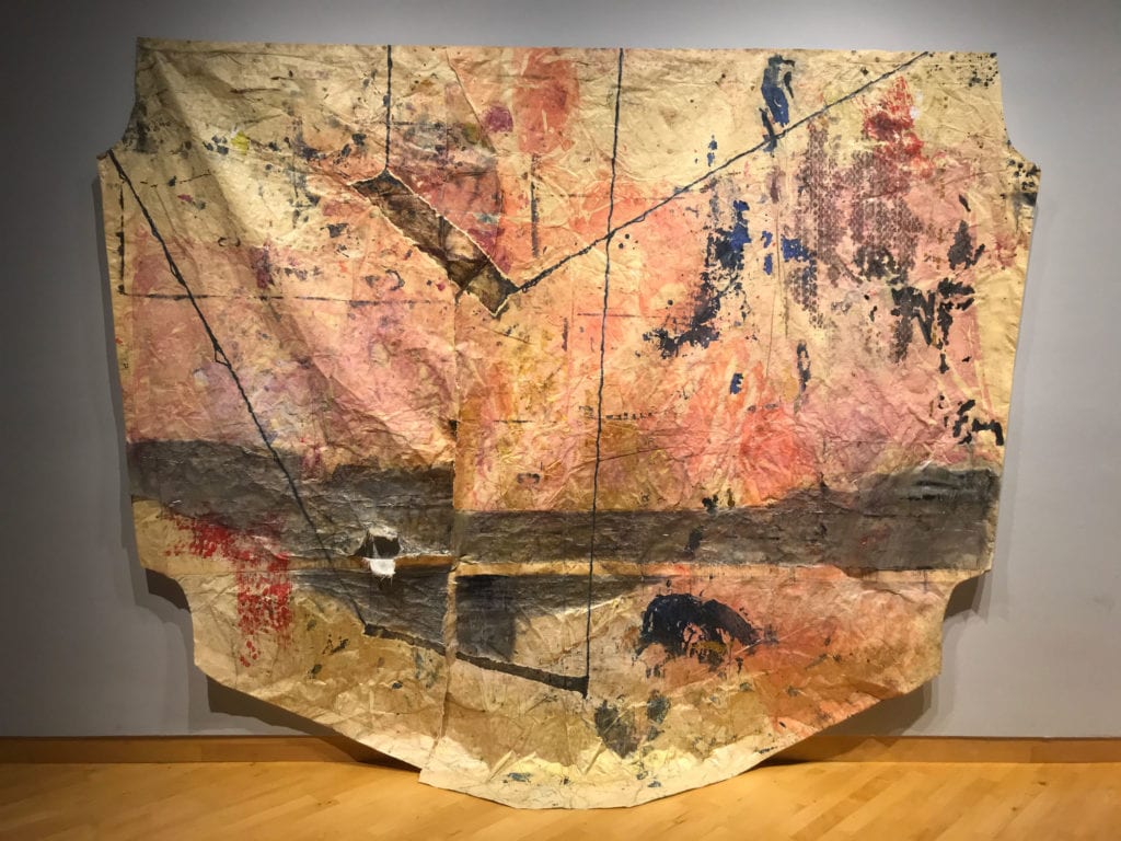 There are no stretchers, frames or forms of physical support. The paintings are on the wall somehow, draping down to sit on the floor. They are large mixed fabrics that have been torn, cut, folded, sewn, added onto and subtracted. The paint not so much sits on the surface as it impregnates like dye. They could be unruly tapestries.