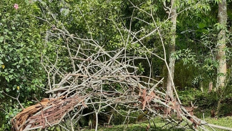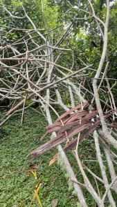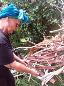 The seemly random placement of the branches, cut from the pink Poui trees located on her three-acre property, formed a sort of chaotic archway that only the fearless dared to enter. The branch ends stuck out in unexpected areas threatening harm to your eye or your body. But this was expected as we were learning how to use the materials and exploring the best way to place them. I wanted to cut them off but Alison reminded me that Goldsworthy, our inspiration, used materials in their natural form.