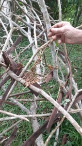 Understanding the materials was a new thing for me. I knew how to carve alabaster stone, mahogany wood and carve linoleum for printmaking, but experimenting with these natural materials created a different challenge. I discovered that the Eucalyptus bark, wet from the rains, would break apart as I weaved them through the cross section of the vines, the vines would break or the branches would move. This was frustrating to me! It had to do with control or no control!! Goldsworthy often mentions the importance of knowing your materials and how they operate. His experimental layering of stones on the sea side of Lancaster collapsed as he experimented with stacking different weights and sizes. Frustrated he started again learning their properties and discovering how the stones operated.