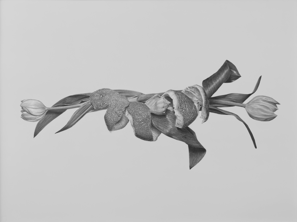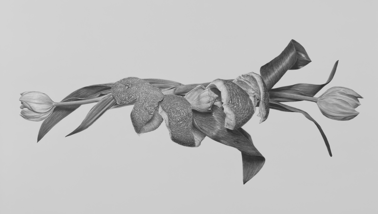 In this drawing, I am working with elements often found in Dutch Golden Age paintings that not only symbolize the transience of human existence but also serve as poignant reminders of the motivations behind our relentless attempts to control nature. The tulips, shell and orange peel become metaphors for the broader narrative of human ambition and its consequences.