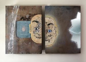 “The artist’s craftsmanship is superb and varied including welding, metal fabrication, incorporation of many different materials and constant attention to the overall composition whereby no single found object dominates its peers. The objects are a wealth of what Southern California is all about – my favorites are fragments of real Cal-Trans freeway signage (what could be more LA!). In total, “Bifurcated Buddha” is a robust creative effort by an accomplished mid-career artist – strong suggestion that