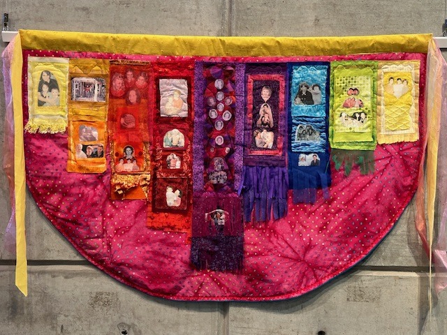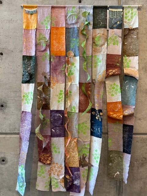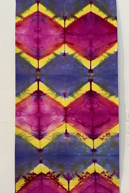 Interwoven Legacies brings together a total of 77 pieces that includes Marlene Glickman’s work and pieces by 33 members of the Guild. On display are colorful quilts, clothing (kimonos and scarves) and wall hangings created in many media and techniques such as printing, weaving, dyeing, embroidery, felting, block printing, screen printing, digital printing, shibori and other surface design.