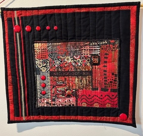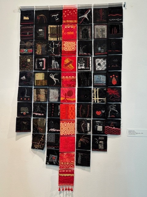 Elizabeth inherited boxes of Marlene’s fabric, some of it already color-coded, and found several pieces already completed. She put together the red strip, added more black. And then she started embellishing with beads.