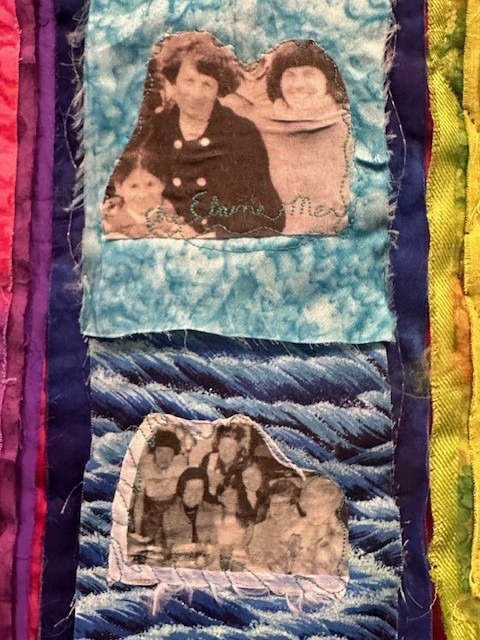 “My heartstrings still tug joyfully and tearfully at unexpected times, especially now while making this quilt, using her clothing and jewelry for the hearts, and remembering and writing about our times together.”