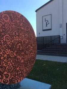 Most of the hookups between words and art during ekphrastic events have been fleeting, of course. Like brief love affairs after which each partner goes his or her separate ways, ekphrasis are often ephemeral events. Not all of them, however. “That young girl, one day, was gone,” Helen Pruitt Wallace concludes in her poem about her youthful bike ride in The Pink Streets, but her poem is now forever alive, linked to Katee Tully’s half of a pink bike. And right around the corner from that pairing at the firm on Terminal Drive is a wall that pairs Peter Meinke‘s poem “Walking by the Dalí Museum” with the painting by muralist Chad Mize that the poem inspired.