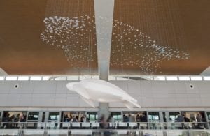 My favorite art at the airport is n + 1, a sculpture by American artist Ralph Helmick of a leatherback sea turtle suspended in the SkyConnect area in the Main Terminal. Floating behind the 10-foot wide turtle are a thousand tiny sculptures of turtle hatchlings hung to echo exactly the shape of the larger turtle.