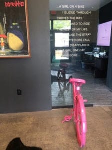 As I entered the cavernous room, appropriately, I was greeted by an ekphrasis: a pink bicycle (well, half of one anyway) by sculptor Katee Tully placed under a poem on the wall by Helen Pruitt Wallace that begins “A girl on a bike” from her poetry collection The Pink Streets (listen to Wallace read that poem here. The pairing was part of Keep St. Pete Lit’s 4th annual Fantastic Ekphrastic.