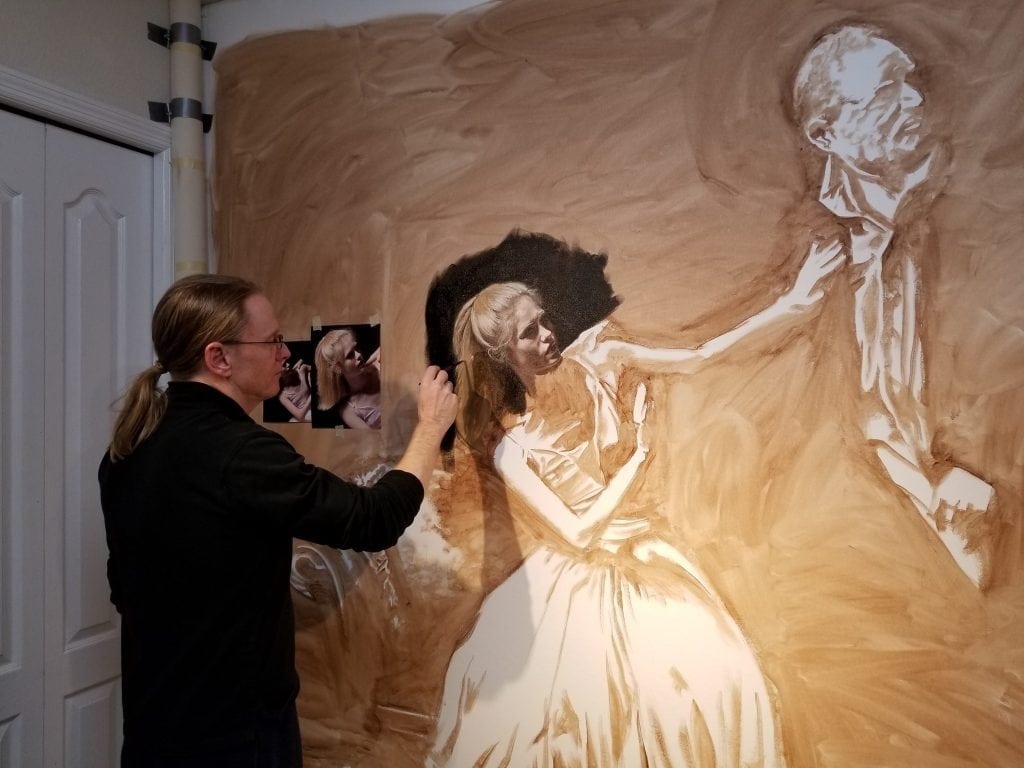 Now that I have my design transferred to the large 7-foot by 14-foot pre-primed canvas, it’s time to put down the first layer of paint! This part is really fun, because there are such dramatic changes in a short time period: