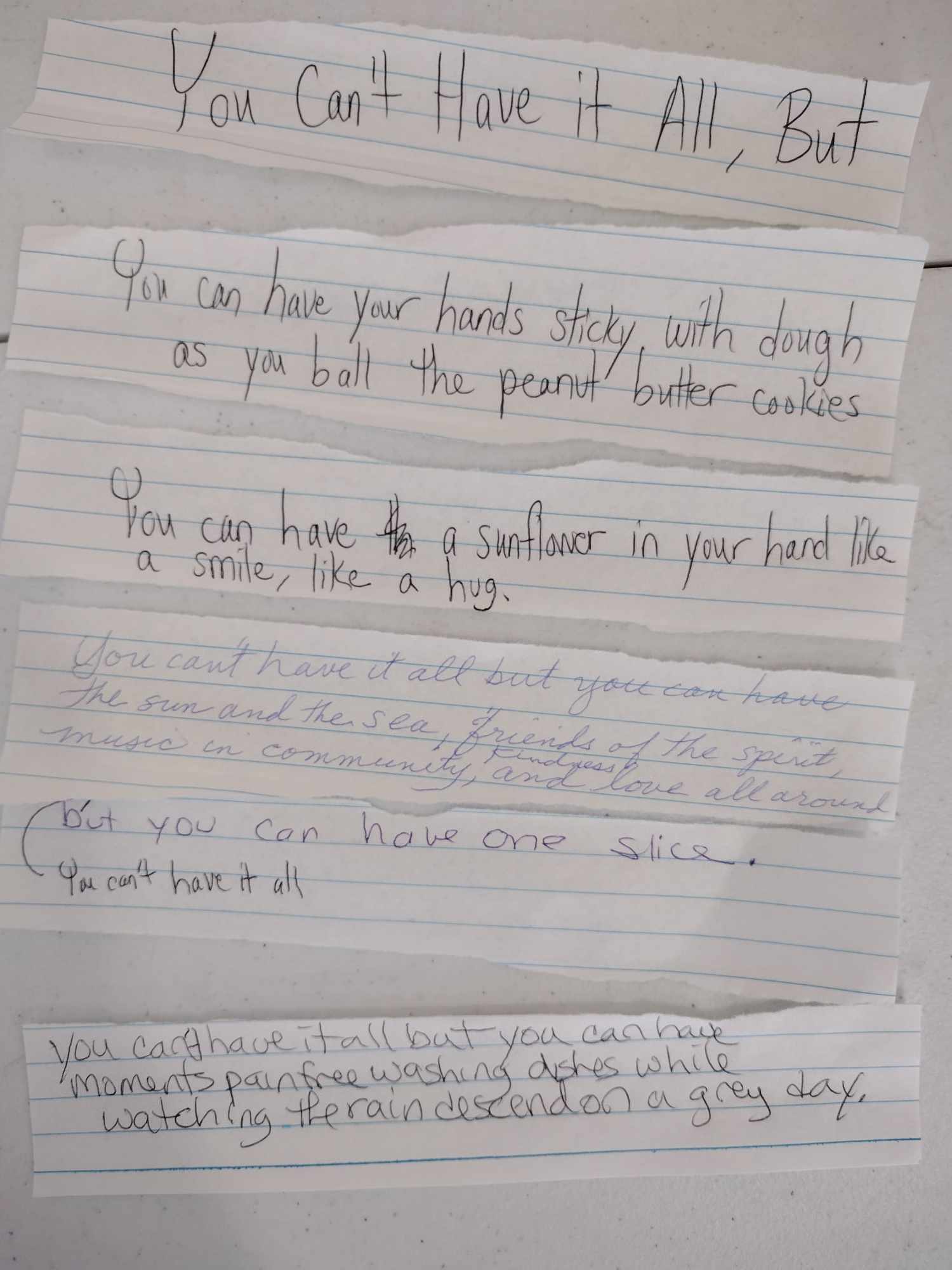 The second, third, and fourth poems below are community poems that we wrote together. Each participant wrote two lines on slips of paper based on the prompt. Then we arranged our lines in an interesting way to create the poem.