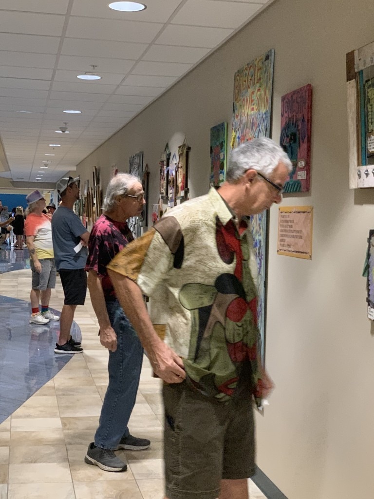The Online Student Activities and Services Coordinator at St. Pete College, Medina Karagic, welcomed a line of people to the opening as Anne Parrette, a former member of the Florida Orchestra, encouraged attendees toward the exhibit with the beautiful mood of her cello. Photographs were taken, and Derkevics shook hands, hugged and mingled, talking to onlookers about individual pieces.