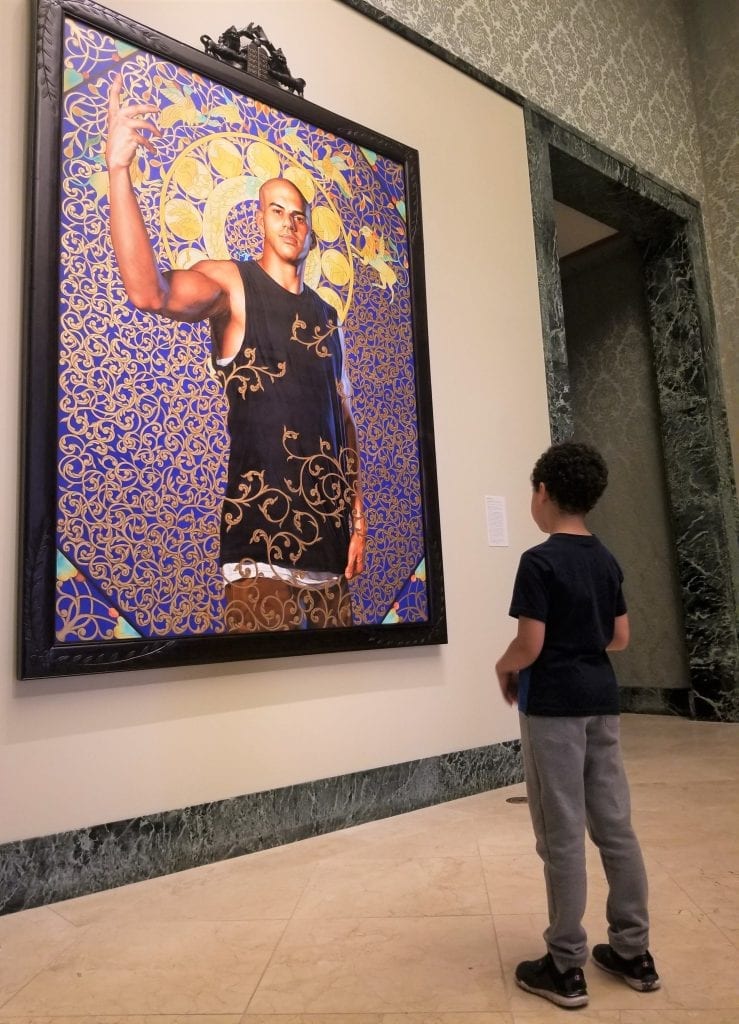 Perhaps Wiley’s best known painting to date is his presidential portrait of Barack Obama that now hangs in the National Portrait Gallery in Washington, DC. Obama chose Wiley specifically for the task, knowing full well both Wiley’s great talent as a representational painter and his reputation as a champion of equality and inclusiveness. In this case, however, instead of depicting Obama in a stance reminiscent of some historic military leader, Obama sits casually in a chair, open shirt collar, hands crossed on his knees, accessible to all.