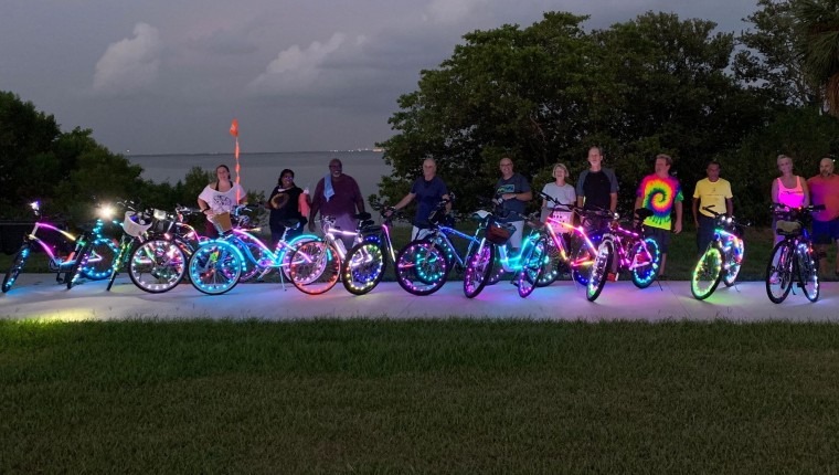 The Glow Riders do 10 miles each Saturday night, which takes about two hours. Whether it’s Clearwater, Dunedin, Snell or Davis Island, the group meets at the location and after taking basic directions from Worthington’s husband or a community leader who knows the trail, the fun begins.