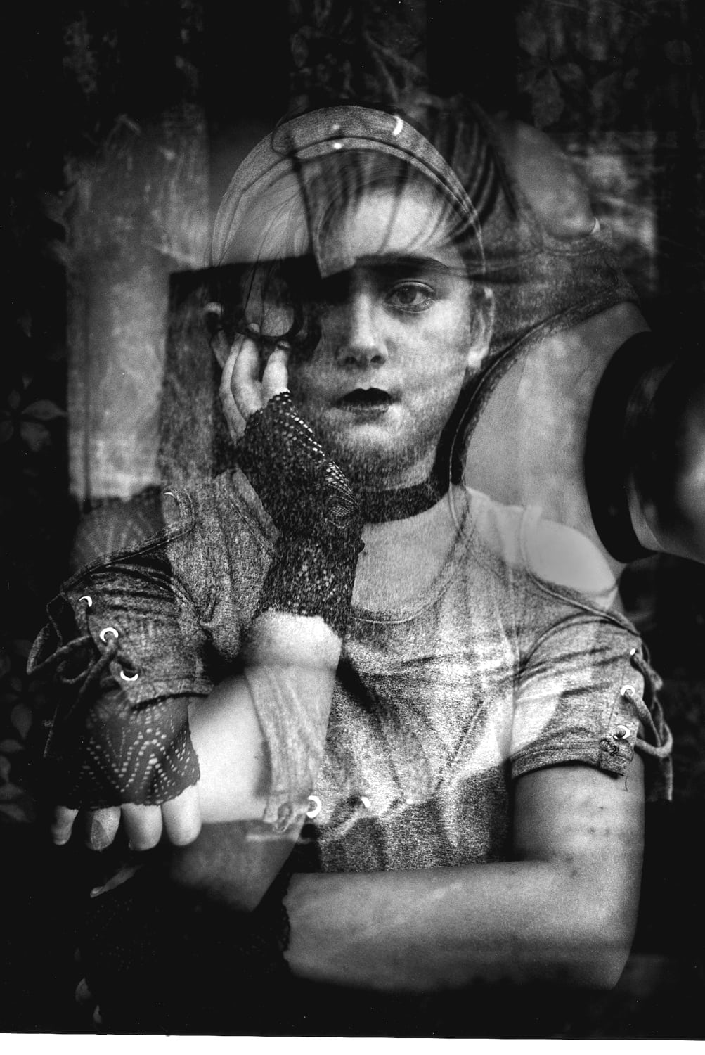 It was only after the wet 8 x 10 print was slapped on the spot-lighted Plexiglass in the darkroom that I saw the potential. I grabbed the L-shaped mat board pieces I use as croppers and slowly closed them in on the center of the print until my eye said stop. I liked how the right angle of the arms formed a border around Lilli. The shirt wrinkles in the horizontal image look like abstracted eyelashes over her visible left eye. I think the graininess and contrast due to the over exposure give the image an intensity.
