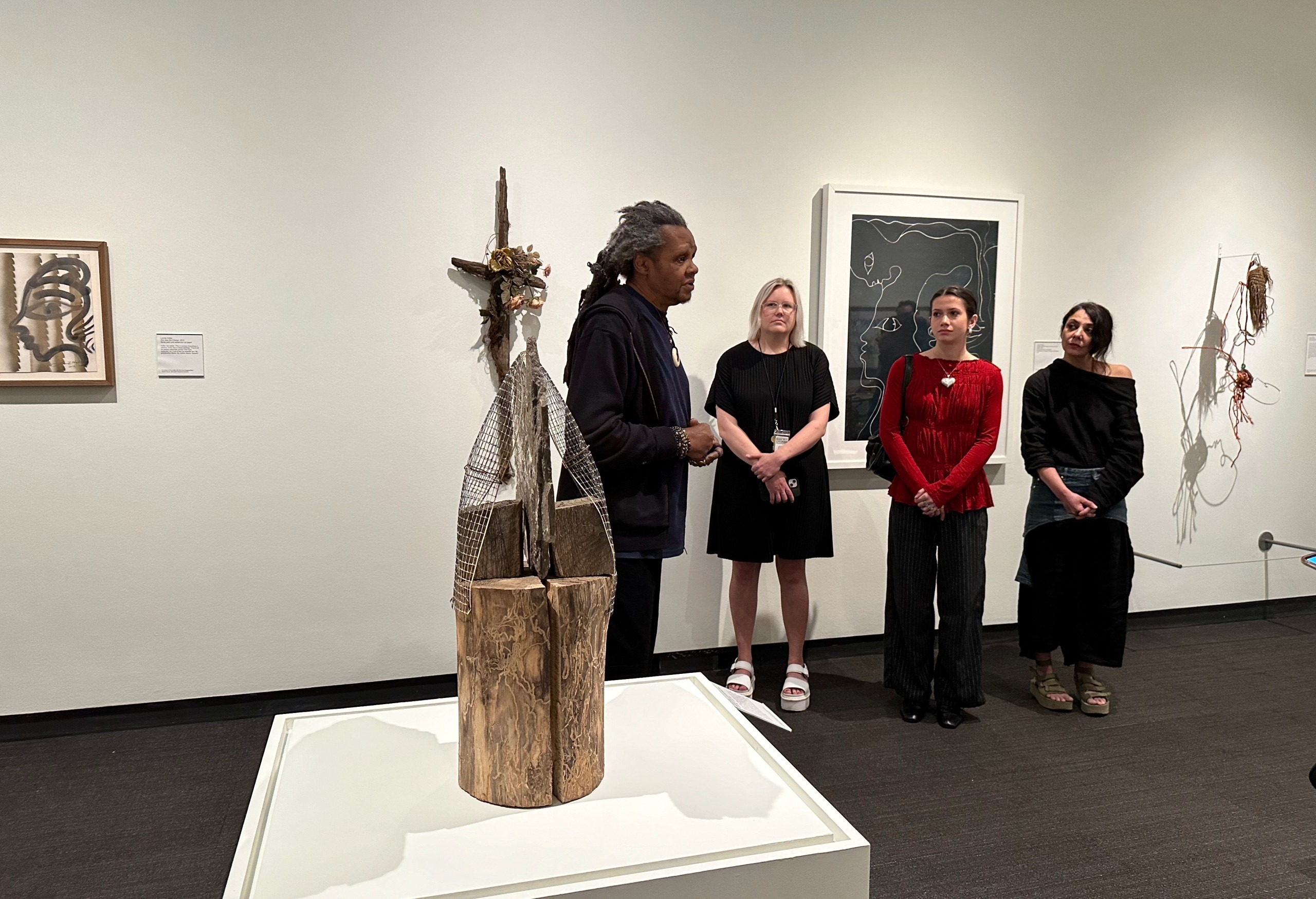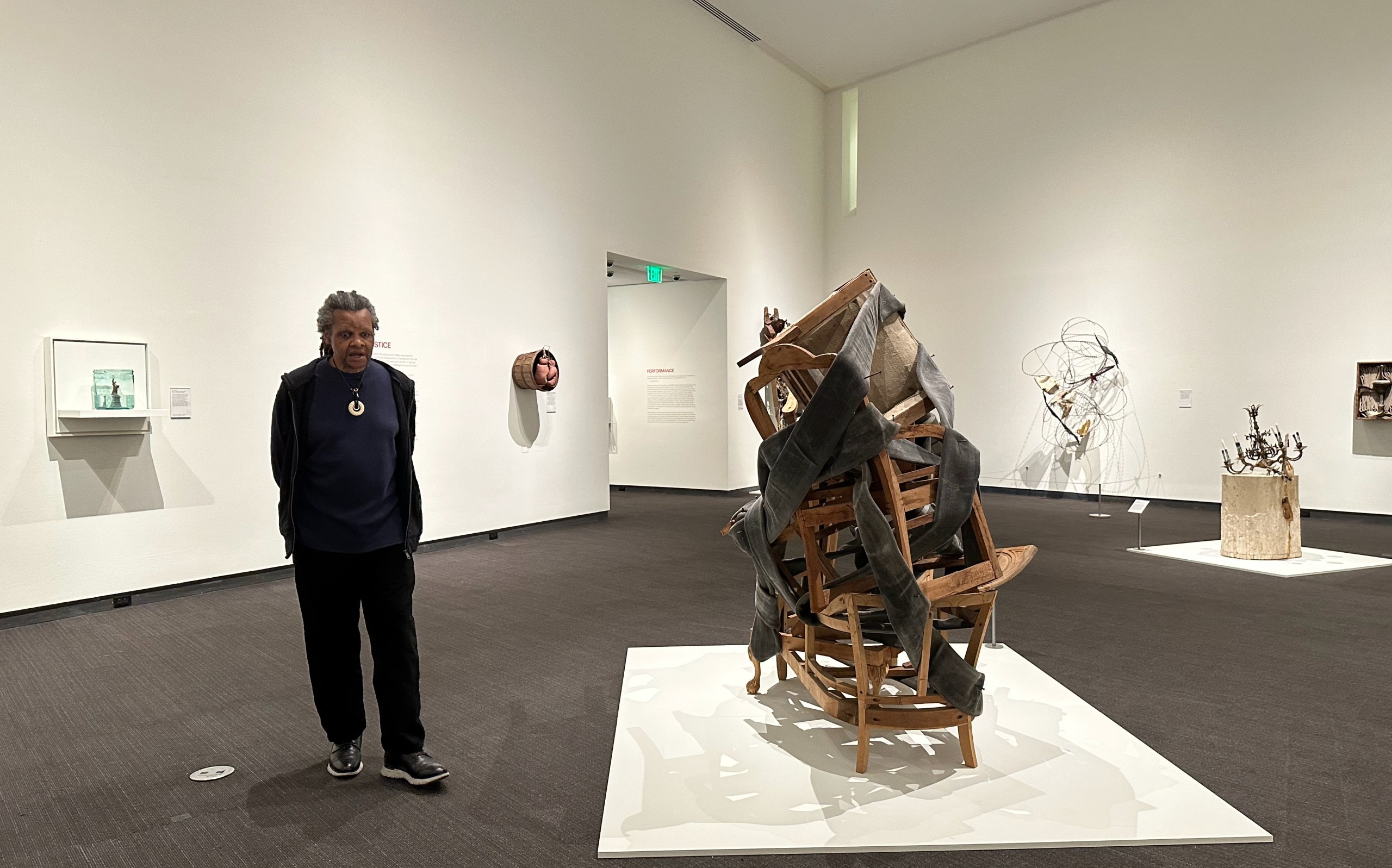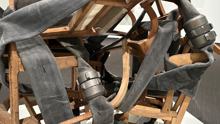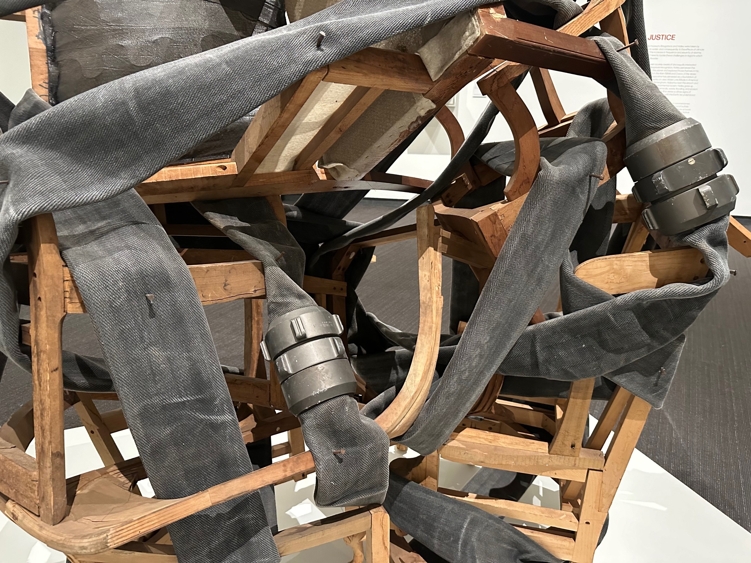 During the preview tour, Holley walked around the center piece Without Skin, the tangled firehose nailed to un-upholstered furniture stacked and joined together, and spoke of a time quite recent when whites-only water fountains existed, of police using fire hoses to drive back Civil Rights protesters… and the everlasting issue of safe clean water and a fight for access and protection is ongoing in places like Flint, Michigan and Standing Rock in the Dakotas.