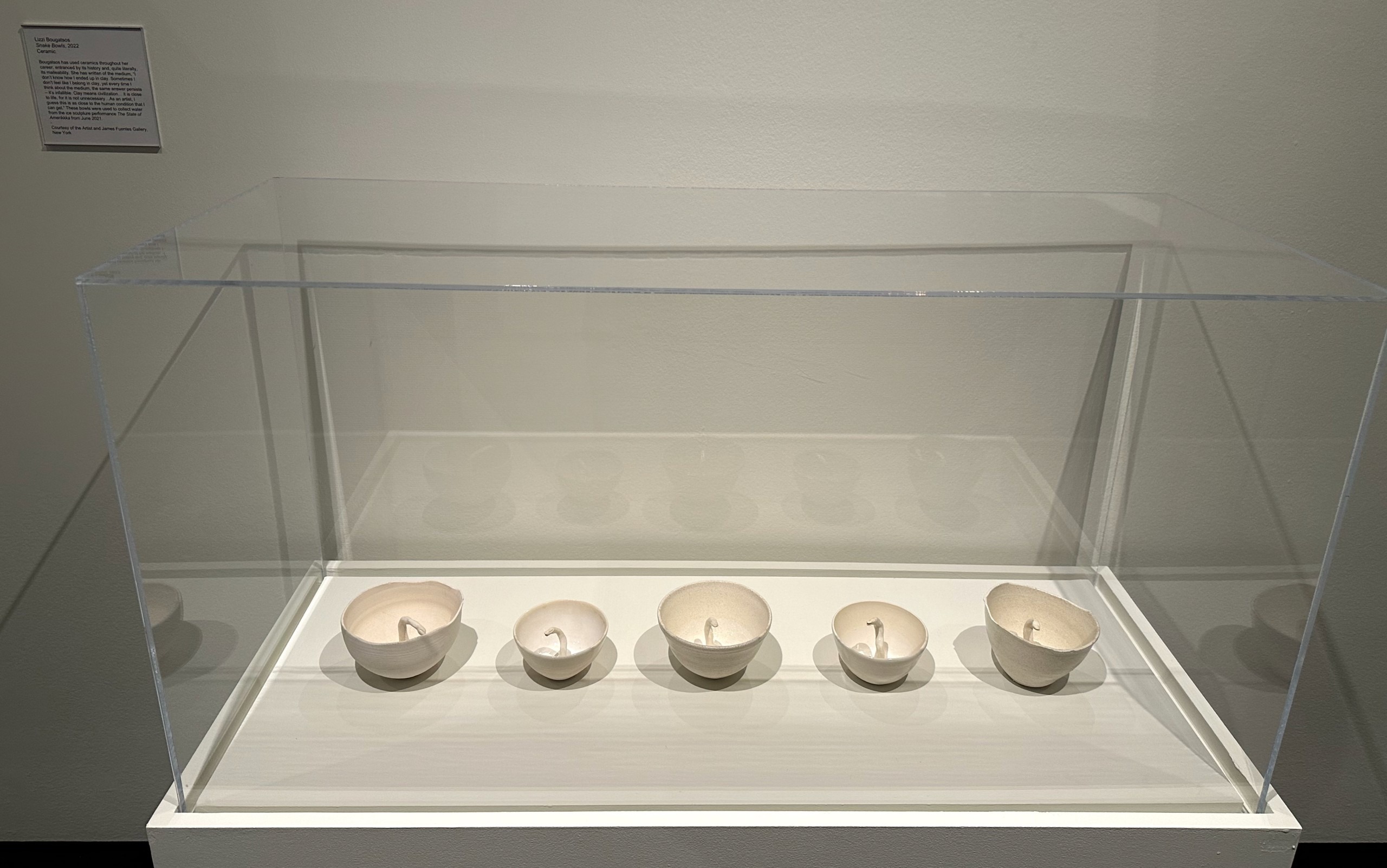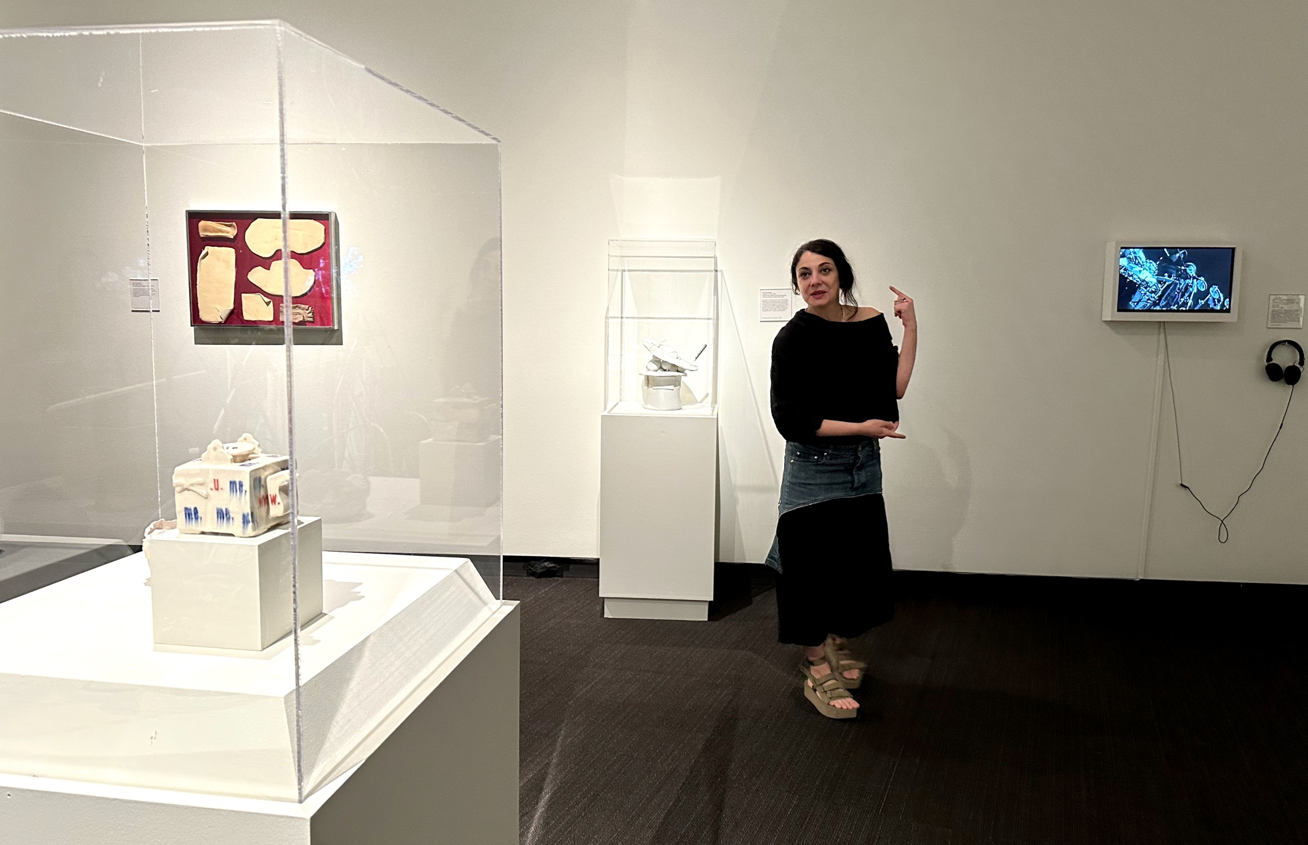 There’s a drawer that once held her art supplies, part of a furniture piece built by a member of her family, soles of her ballet shoes within a box within a frame called Shoe Souls, and a tea towel that she spilled coffee on that belonged to her aunt, one who introduced Bougatsos to ceramic.