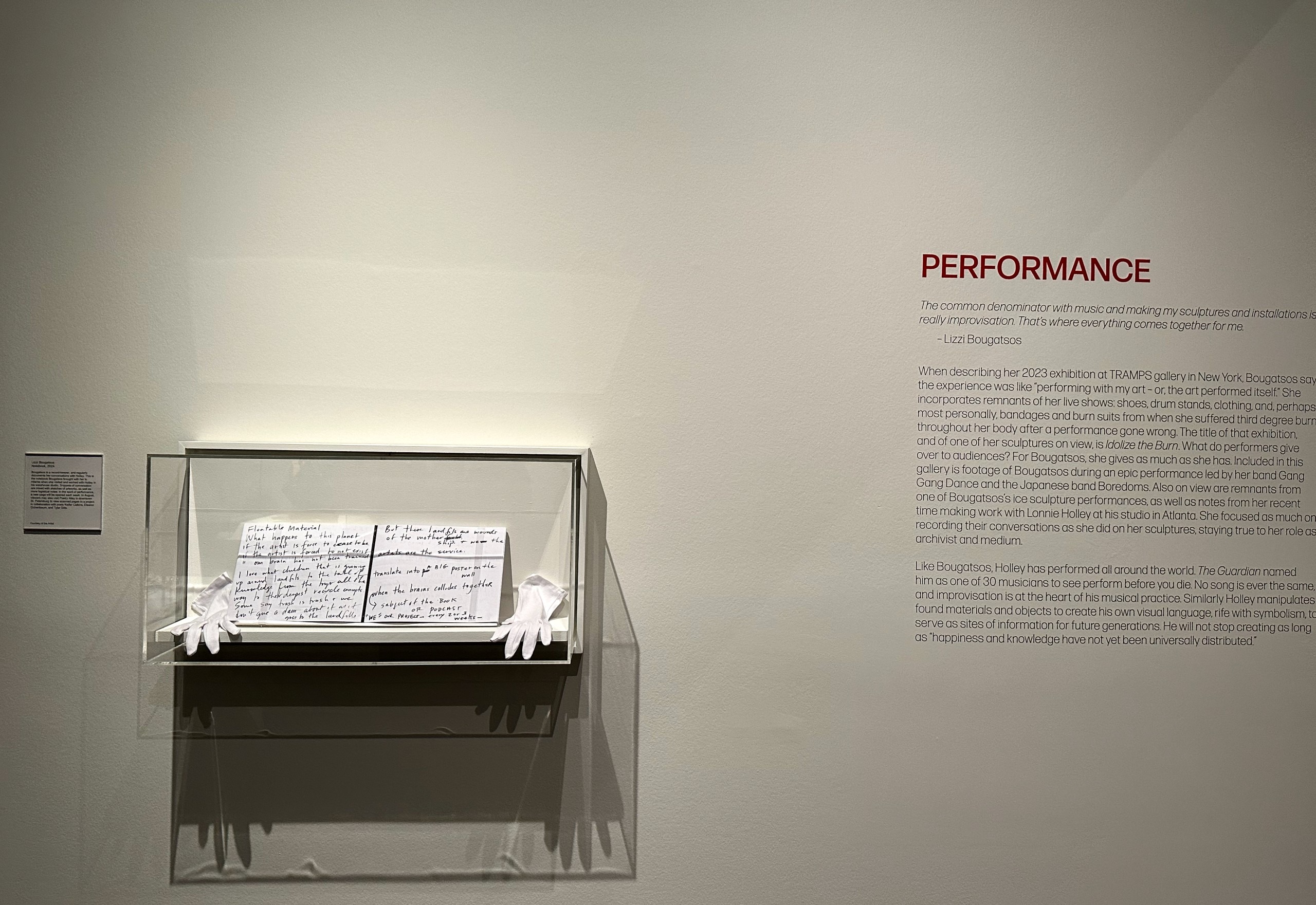 At the entrance to the gallery is a notebook where Bougatsos recorded her conversations with Holley mixed with sketches while visiting his studio in Atlanta, reflecting over ten years of friendship and collaborations.