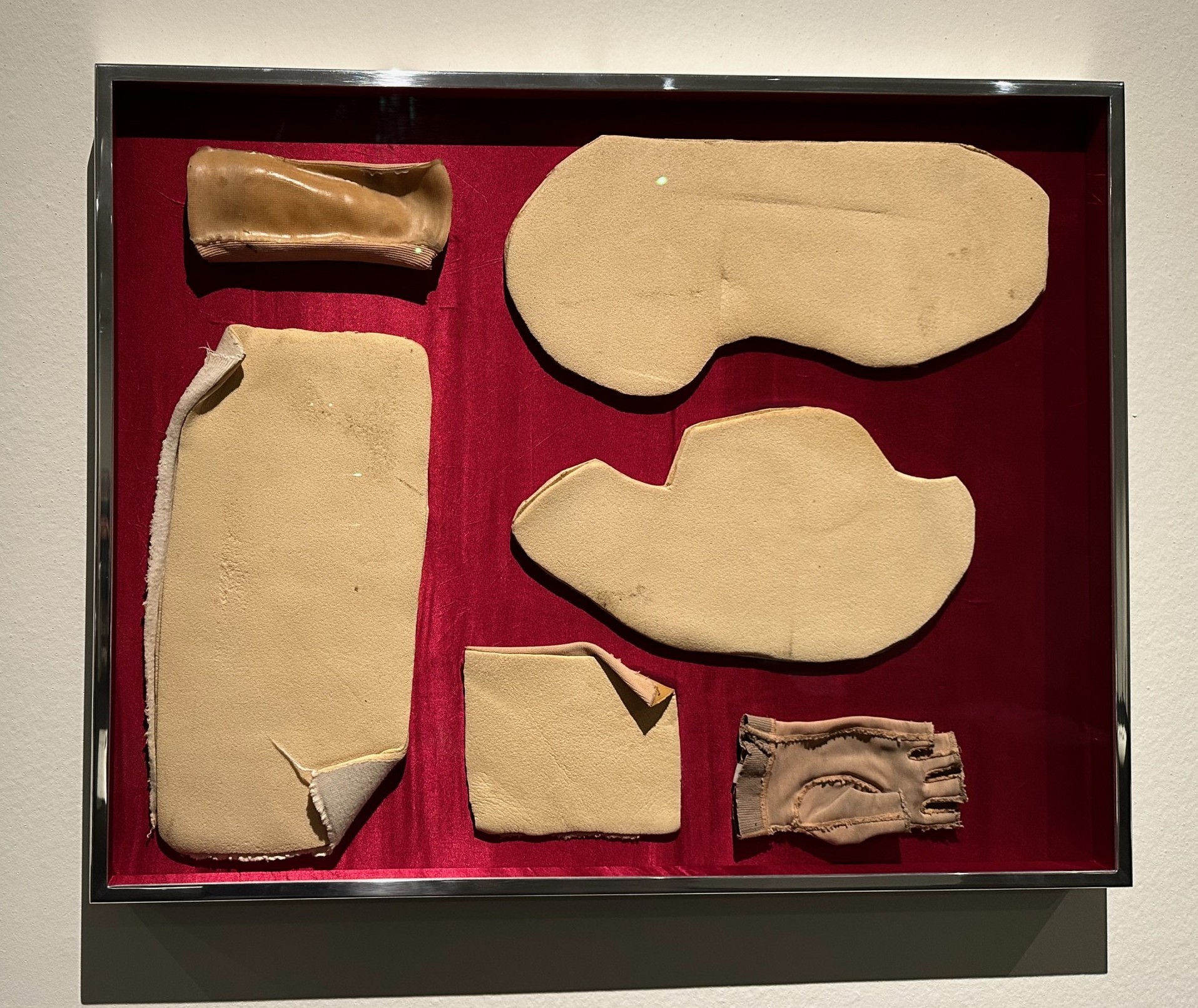 Several pieces reference the burns Bougatsos suffered in a 2001 performance when her costume caught fire. The Opera, a framed composition of bandages from her recovery process are abstract forms on a red velvet background that “hints at the interior of a jewelry case.”
