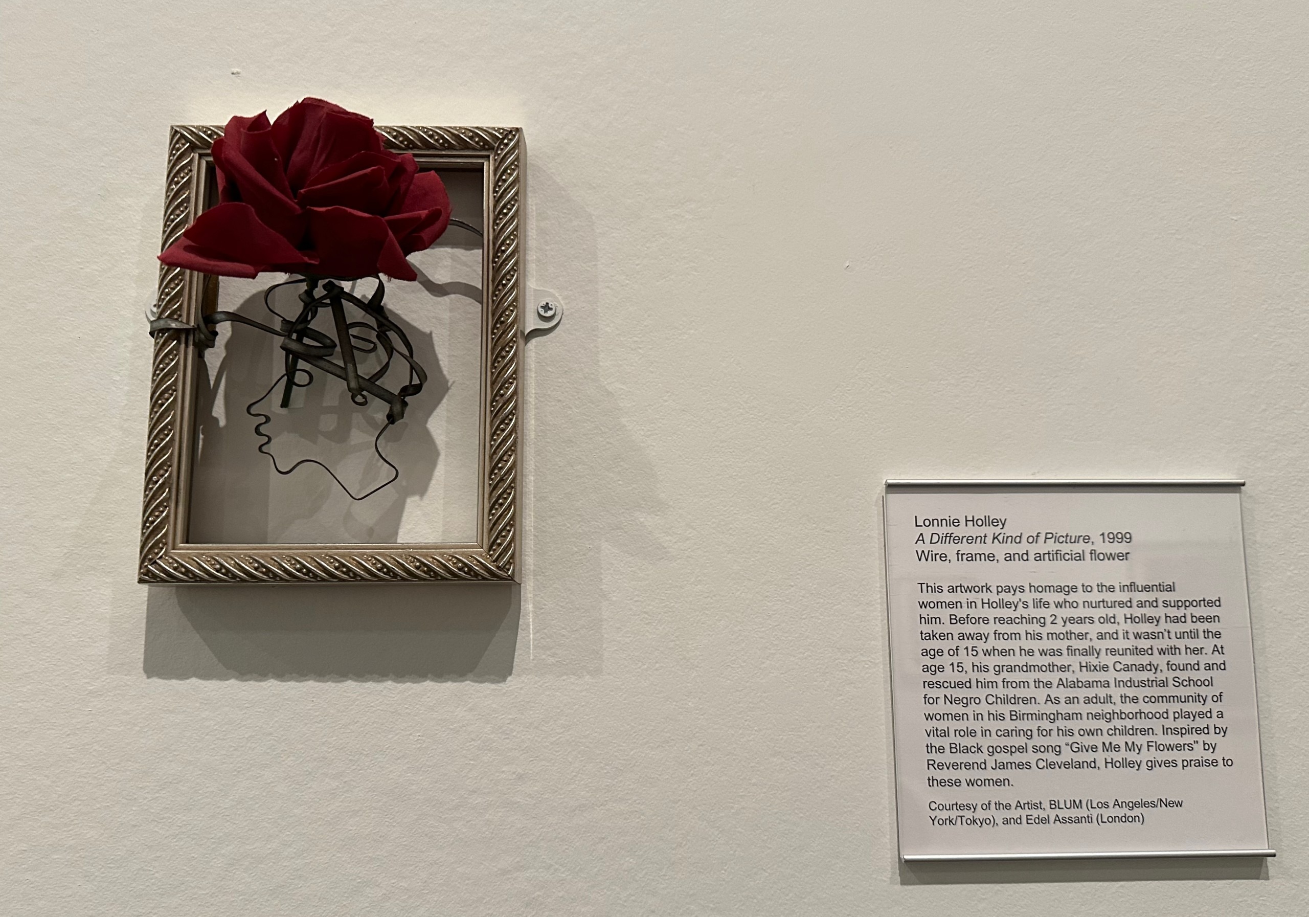 Here is Holley’s 1999 piece titled A Different Kind of Picture. Inside a small silver frame is a wire outline of a person’s head in profile with a red rose hovering out beyond the frame.