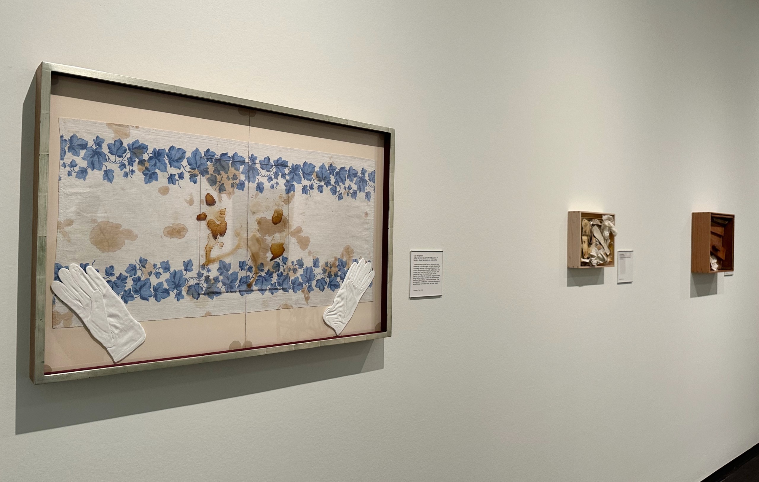 Along the same wall hang several of Lizzi Bougatsos’s shadow box assemblages, collaged from personal artifacts and heirlooms she has carried through her life.