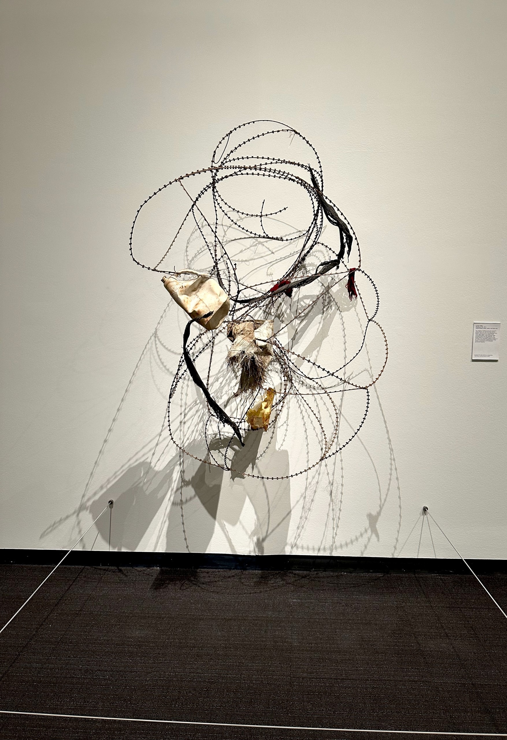 On the wall behind are looping razor wires with stuff caught in its cutting points.
