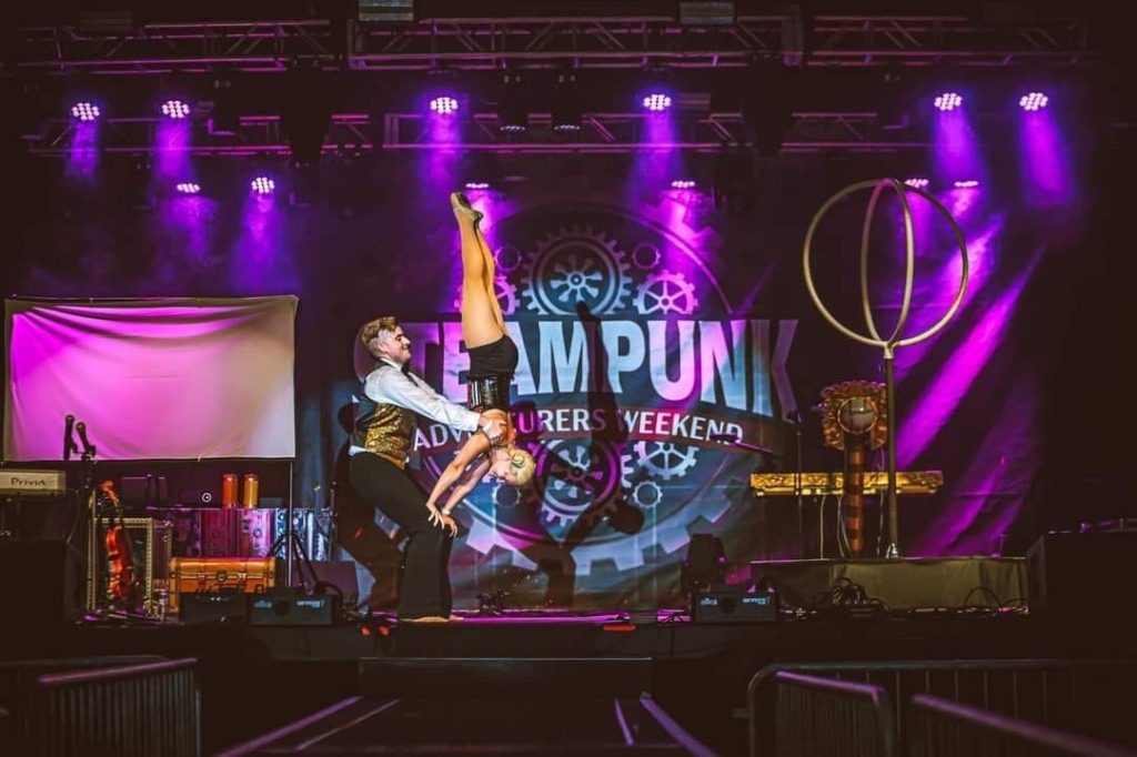 Our shared talents of acting, improvisational comedy, and our newfound love of partner acrobatics laid the groundwork for what would become our first original show as a duo – Tank and Tilly’s Clockwork Cabaret.