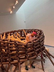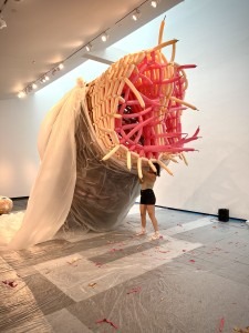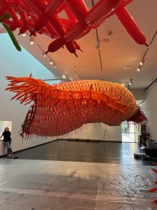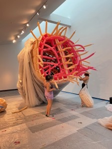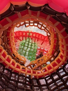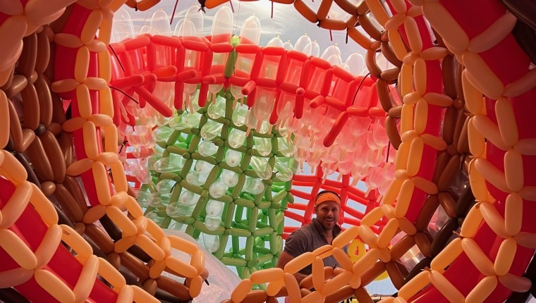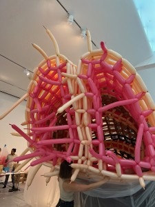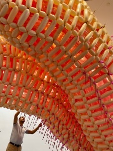 The process begins with machines inflating and bagging hundreds of balloons that I then twist and tie together into a matrix. From the matrix, the forms grow and grow. It is much like space frame architecture. In order to keep the forms growing in the right direction it is important that I remain fully present and stay locked in the experience. This way I am really in tune with what is happening and I can see many steps down the pike how the sculpture is going to shape up. Doing this is a bit like meditation. It takes strong mind control and focus. Some call it being in the “zone” In this state, much of the rest of the world and even time falls away and all there is is the very step I am on at any given moment throughout the entire build. Over the years my work has had a very profound effect on my mental emotional state and I think has been a driving catalyst in my conscious awareness practice. Also the fact that the work is temporary and we spend so much time and honor the process so fully is another way of being truly connected to the surrendered state.