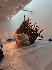 The work must take place on a clean and soft surface so the balloons don’t pop as I’m putting them together. For this we laid down a few dozen moving blankets and covered them with a thin polymer film and we work in our socks. Fun!