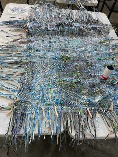 You can accomplish much in five days. A big space allows you to truly see what’s in front of you. I reinforced all five “mosaic” pieces, blobs of randomly woven color, and connected sections, sewed on countless beads and drew out my close-to-final layout. A few days I worked 10 hours straight! Came home, worked another three hours and then went back the next morning.
