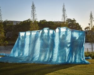 The Water piece, Tidal Pulls, finds Eugenie as a coastal biologist who feels the tug of distant galaxies in the shifting of the tides. It’s a quiet piece I wrote for Eugenie, and feared would be a let-down at the end, as the pace slows down considerably. But Tidal Pulls turned out to be the most moving moments of all, as Eugenie wades through blue parachute waves that really feel like water, looks up at the stars and beckons Chris into the water.
