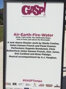 When David Warner asked Helen Hansen French and I last fall to come up with an outdoor dance-theatre piece for Creative Loafing’s GASP! Festival, an amazing celebration of the arts to be held on March 16 at Tampa Museum of Art, we didn’t realize what an evolving and exciting collaboration Air-Earth-Fire-Water would turn out to be.