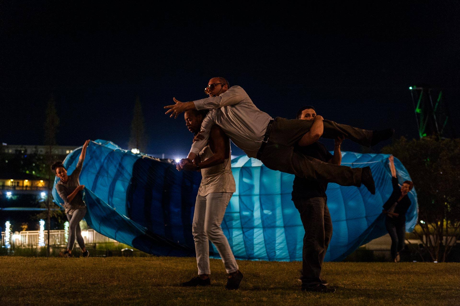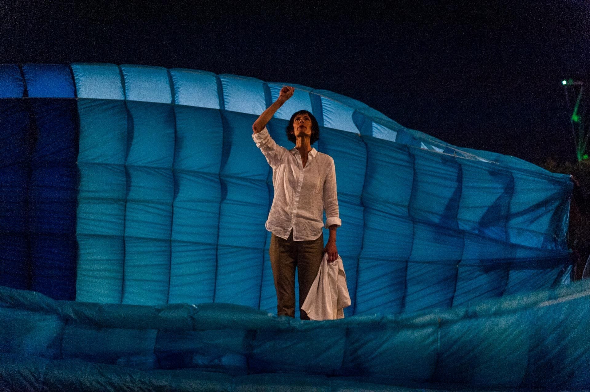 The Water piece, Tidal Pulls, finds Eugenie as a coastal biologist who feels the tug of distant galaxies in the shifting of the tides. It’s a quiet piece I wrote for Eugenie, and feared would be a let-down at the end, as the pace slows down considerably. But Tidal Pulls turned out to be the most moving moments of all, as Eugenie wades through blue parachute waves that really feel like water, looks up at the stars and beckons Chris into the water.