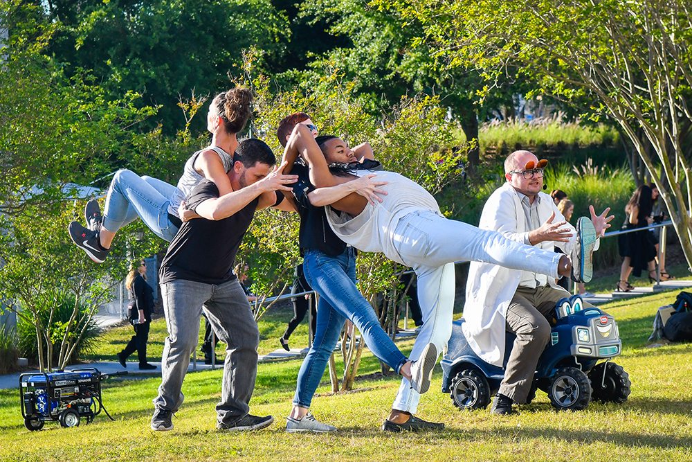 Helen and Alex invented the hilarious traffic jam around Chris, with dancers driving slow and driving fast, and hilariously slamming on the brakes. When Erin and Brian arrived they devised the four-person “minivan” – and I thoroughly enjoyed the many serious discussions of how to go from minivan to the “ta dah.”