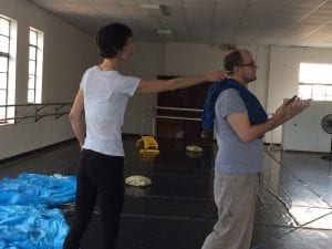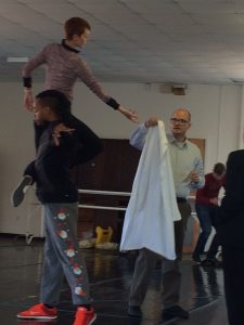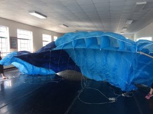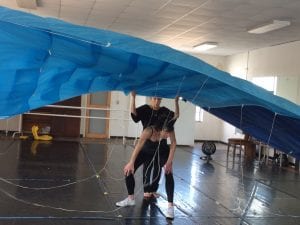 Helen’s husband Jon coached the actors and dancers on maneuvering the parachutes, as the one person among us who’s jumped out of a plane with one. The parachutes are real, thanks to Helen’s para-rescue friend, military-grade and a wonderful blue, which means our original idea of using them just for Chris flying in Airborne has grown into beautiful blue waves around Eugenie for Tidal Pools.
