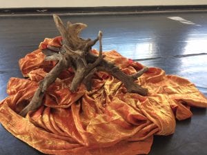 Helen has a wonderful piece of driftwood that’s shaped like a pile of firewood, and when Paula drapes it in the flamboyant red and orange cloth we’ve used as a volcano, a sandstorm and flames in other projects together, it looks like a lovely campfire.