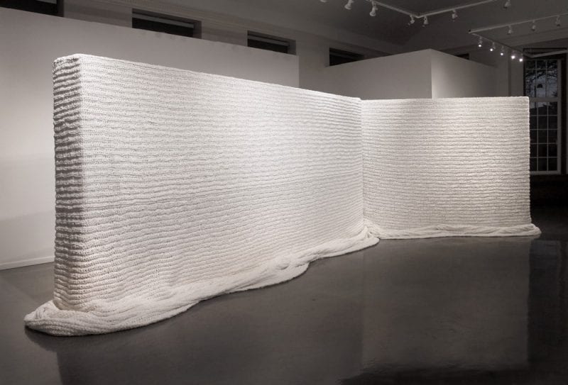 She has remained responsive to cross-cultural points of view, finding, for example, an affinity between the Bauhaus aesthetic with its emphasis on essential forms and the spirit of Buddhism that is part of her own cultural heritage. Kotani made an extensive study of the scratched bark drawings of the women of the Mbuti, a pygmy tribe living in the Ituri rainforest of the Congo. These drawings provided further insight into the ways in which one might combine representation and abstraction. Her own drawings based on these works led to the set of variations Black on White (#1-8), a series of stitched drawings exploring the permutations of line and circle in complex networks of connection. Kotani also remains attentive to the phenomena of the environment, from the intimate space of her studio in winter (as in the delightfully wry Pollen in Winter, inspired by the studio’s ambient dust), to the unleashed energies of nature at work on a grand scale. Kotani’s works in this scale include Andes I, a recollection of the aerial panorama seen on a flight over the mountainous topography of Peru, and Storm-Daniel, inspired both by images of the hurricane that hit the Hawaiian islands in 2000 and by her own reflections on human frailty and the fearsome beauty of nature. Where Kotani had traditionally woven the canvas backings of wool or silk for earlier work, her use of linen scrim (used for theater sets) here provides the opportunity to work on a substantially expanded scale.