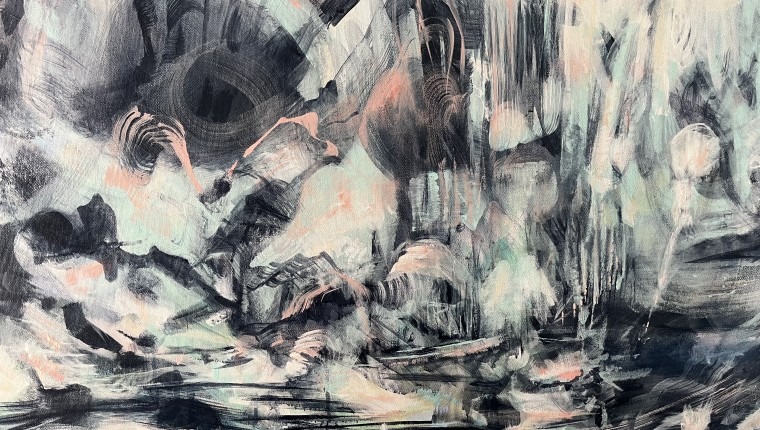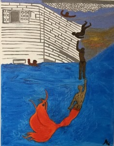 Two of my paintings were selected for the current exhibit, Mermaids and Myths at The Factory in St. Petersburg. I created them in 2020 at the height of the pandemic. Then as now, my creative process starts with little to no intention. I start off thinking that I will create some kind of abstraction but soon I often find the water elements emerge. The atmospheric build up of space along with unplanned figurative components also appear. Sometimes I paint the recognizable objects out, other times the composition shifts to accommodate them.