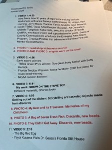 I had written a rough script and storyboard (plan for narrative and insertion of photos). In the course of videotaping, my phone repeatedly stopped so I ended up breaking up my story into segments. Creative Pinellas Curator Danny Olda would be doing the hard part of editing. At this time, I’ve been able to upload two segments…I might have to redo.
