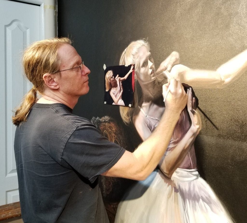Florida artist Kevin Grass is working on one of the ballerina figures in his Not #MeToo painting.