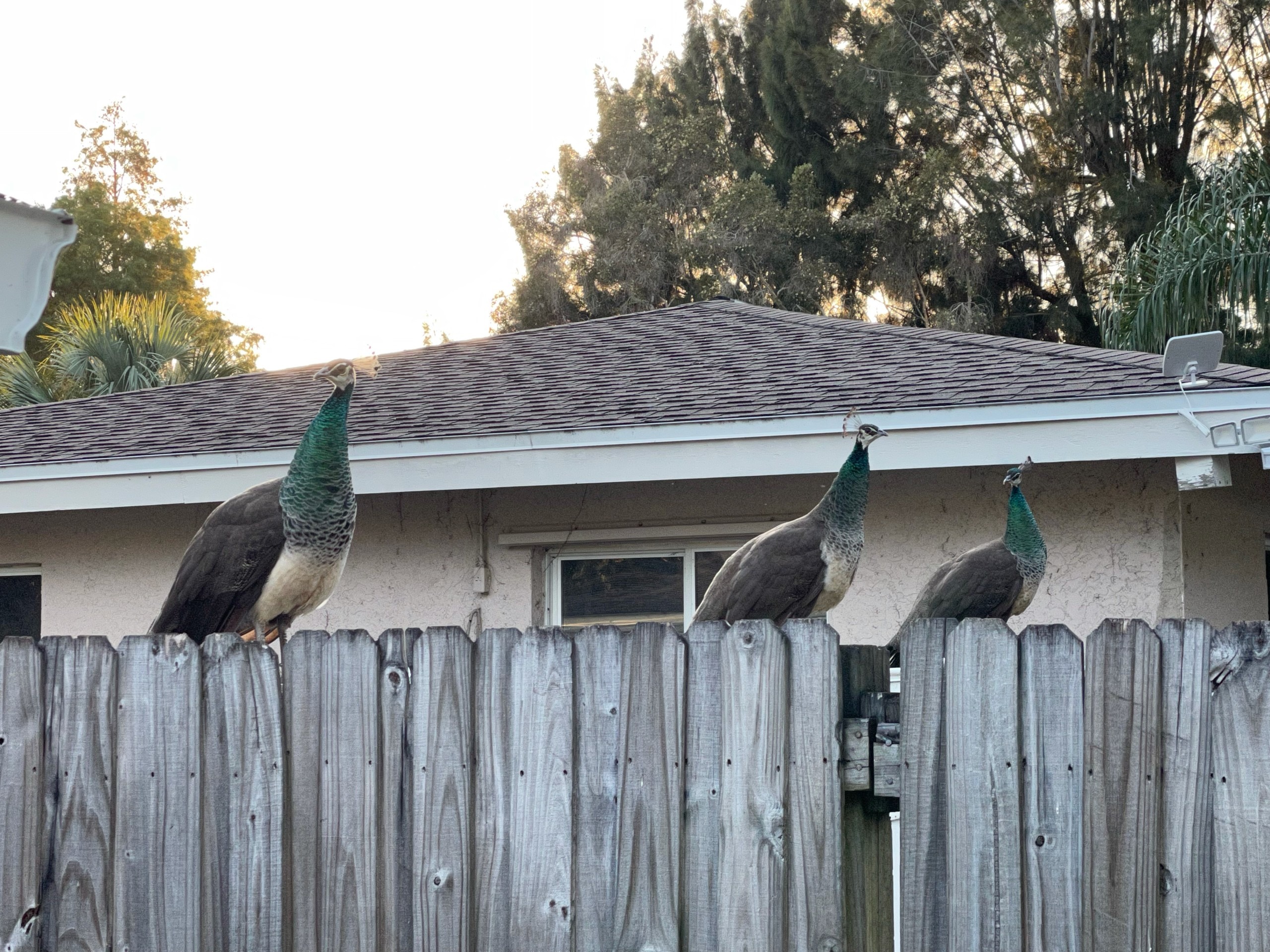 My most frequent visitors have been three female peacocks. I call them “the ladies”. They make sure to get my attention when I am home. I came out of my house the other day to find all three of them waiting for me.