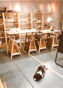 My studio has a nice open plan where there is enough space for 3 adjustable tables, a slab roller, 3 pottery wheels, shelves along almost all 4 sides, all with enough room to roam around. My dog, Oreo, pictured above, also hangs out with me during the days while I work. Having enough “space” was my largest obstacle when looking for studios. Because I work with so many tools and supplies, it was slowly taking over when I worked from home.