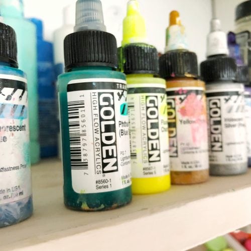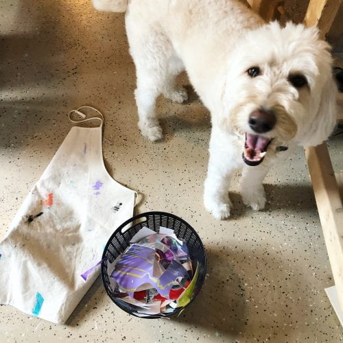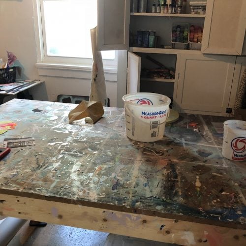 In the center of my space is another large work bench that didn’t take very long to break in as it is not covered in paint and is the colorful centerpiece of the room. This table is used for everything from painting to packaging work! The opposite wall is lined with cabinets where I store all of my paint, glue, smaller tools, etc.