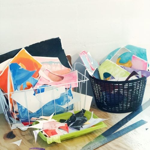 Several other areas of the space have several baskets and smaller bins full of colorful piles of scrap papers and paintings.