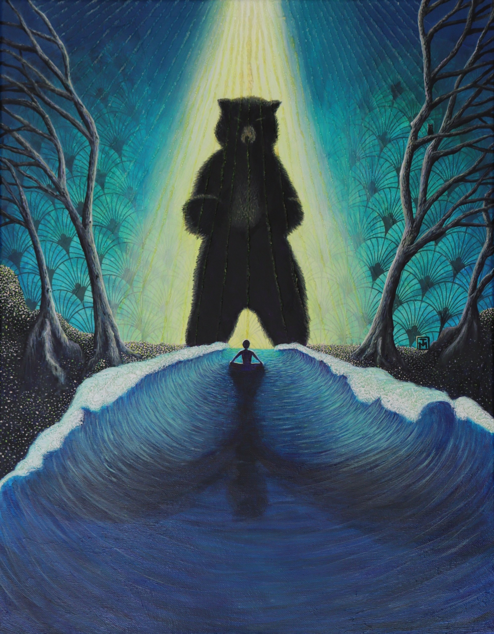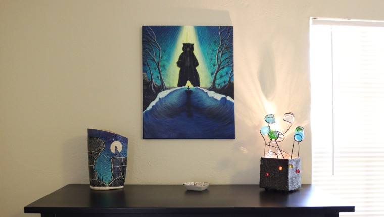 The acrylic painting in the middle is a piece I created in 2020 during the pandemic. It was an extremely isolating time for me working and living alone at home. But the tension and fear from everyone around me was extremely strong. So, I directed that energy into this painting. It represents holding space when you are confronted with fear.