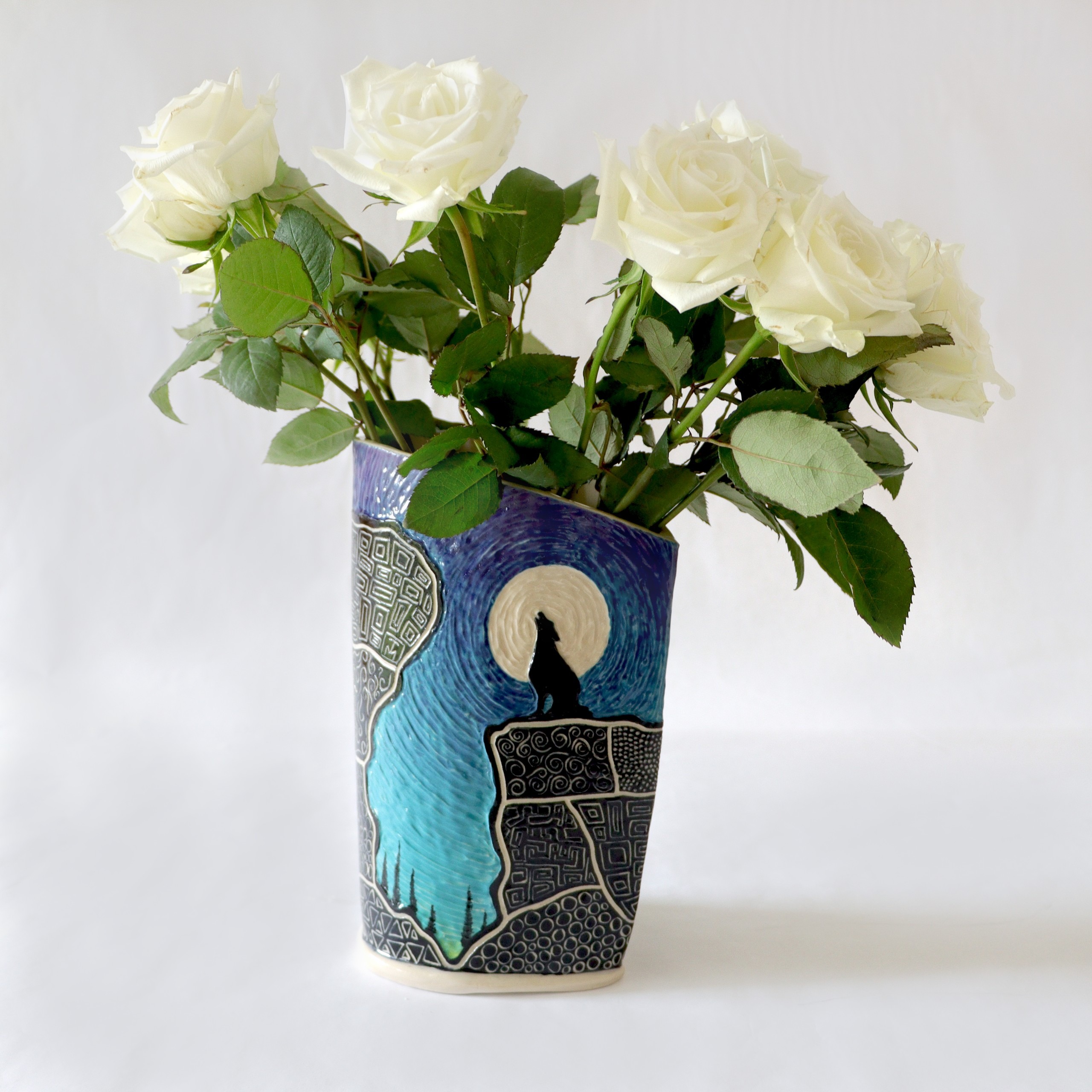 And the piece on the far left is my current favorite medium – ceramics. This vase has a 360 degree view of a landscape around the entire circumference. It is the main reason why I love ceramics. I am able to combine my love for painting/graphics and 3-dimensional art. The shape of the ceramic lends another layer to the meaning of a piece. This piece symbolizes the fullness of speaking your truth.