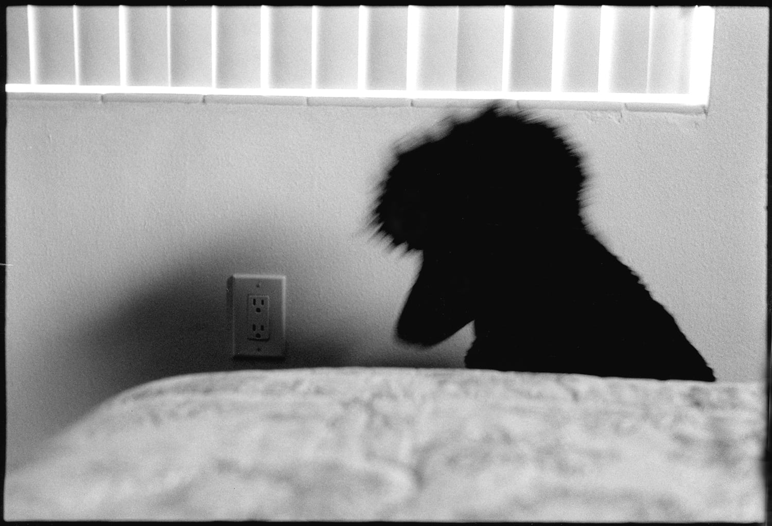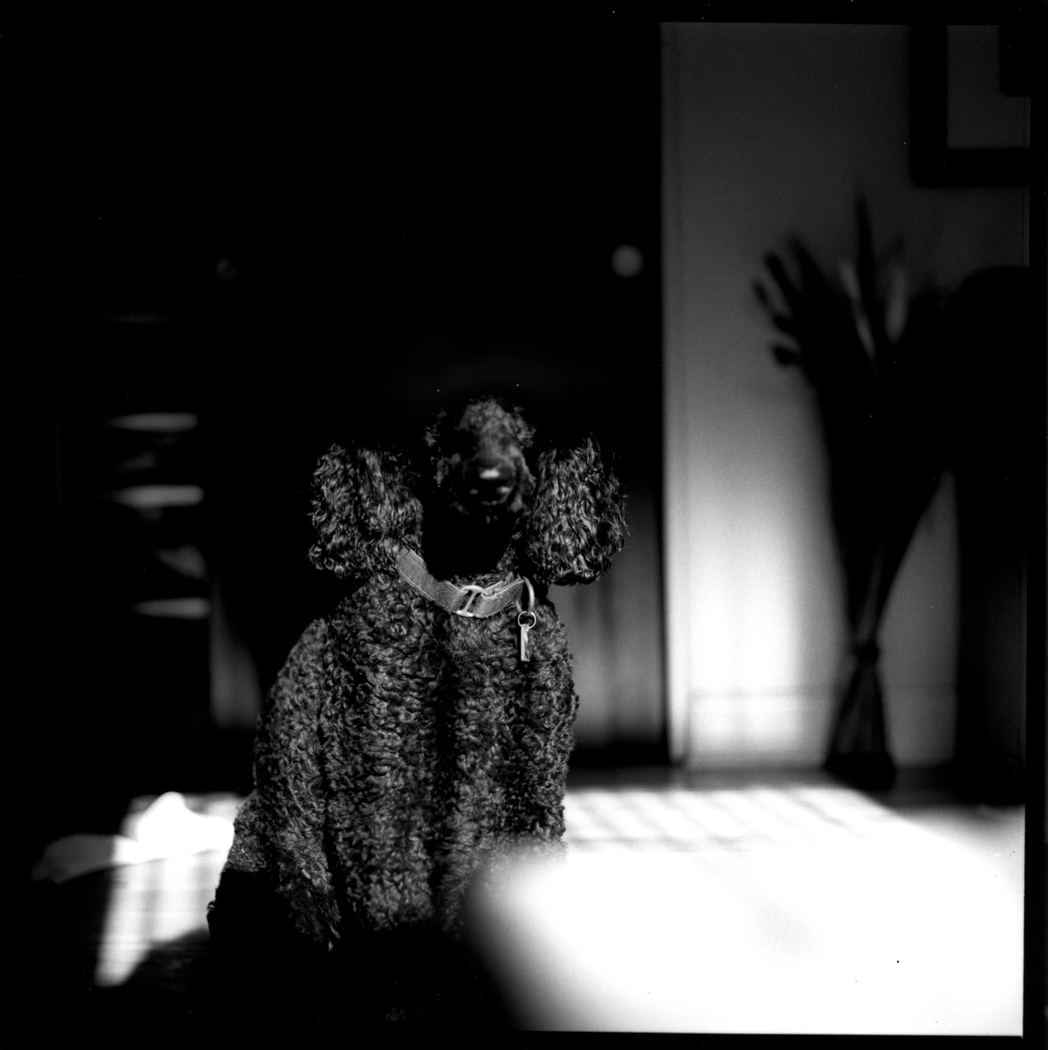 The image below was intended to be more pointed, a sharp portrait. I had awakened to see Stella staring at me. Her eyes were intense and demanding. She had that look dog eyes have when they want something; sadness, hope, urgency and patience all at once. The direct sun through the window above the headboard lit her curly hair. I grabbed the loaded Hasselblad from the closet behind her, returned to the bed, and opened fire at with the lens wide open to blur everything except her. Had I tried to move her closer to light her eyes I most likely would have lost the shot. A trained doggy model she is not.