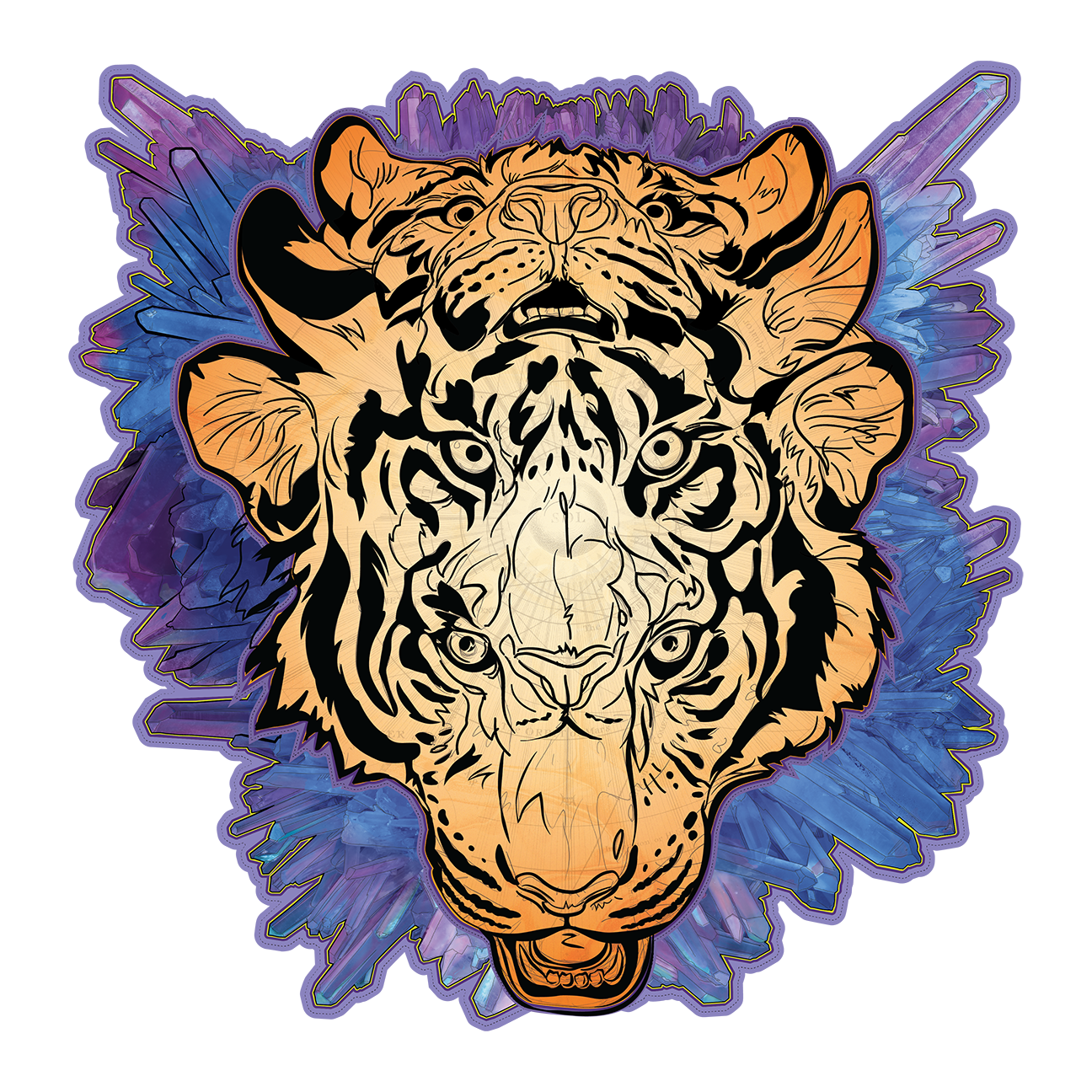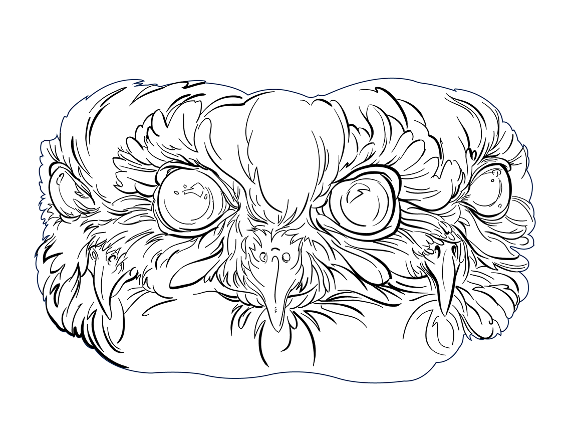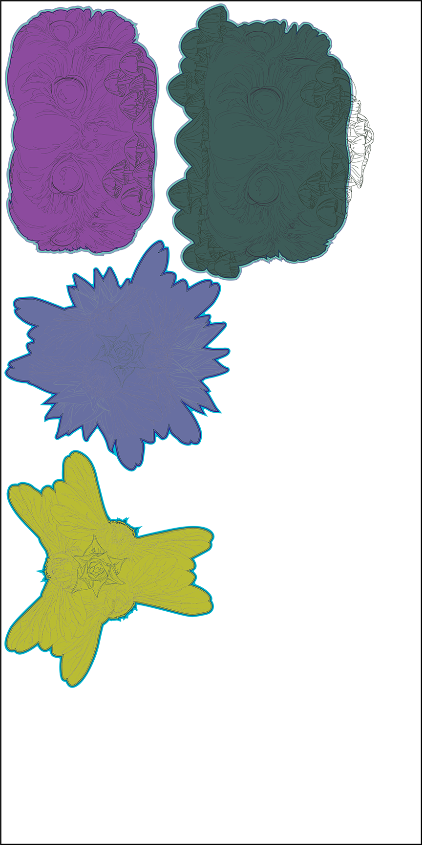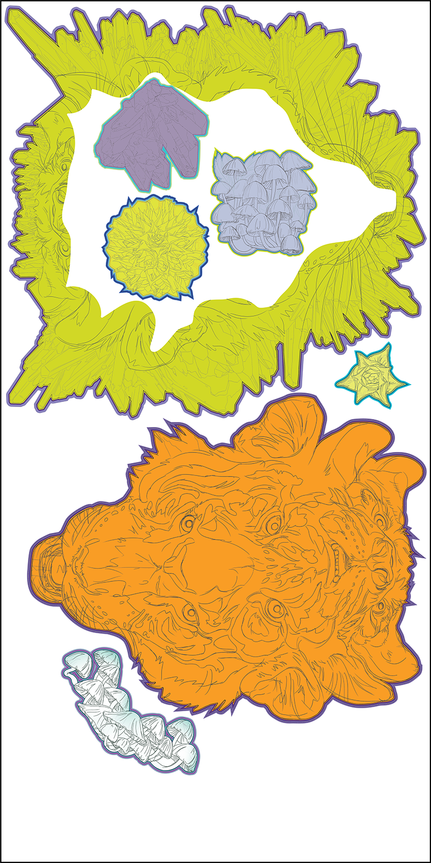 Once the process of roughing in my vector line work begins, I like to place a few rough/in-progress color .pngs into clipping masks. This allows me to work more flexibly, instead of laboring over each and every little detail of vectoring, thereby running out of time for the most essential aspect – color and texture.