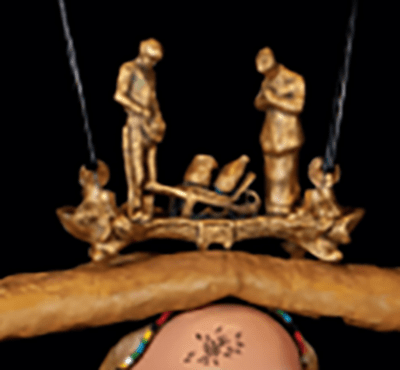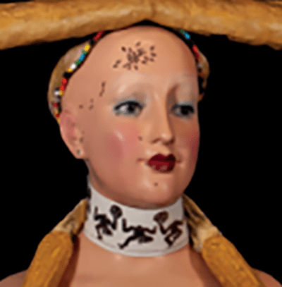 The female bust wears a feather cap with beaded trim fashioned by Dalí. On her forehead is a painted cluster of ants.