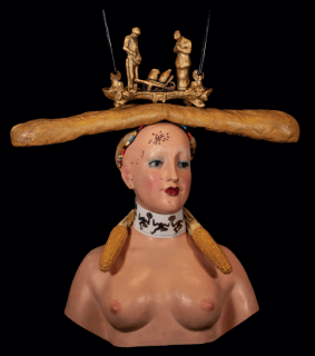 Consisting of a female bust cast in hand-painted bronze, Retrospective Bust features a feathered cap, beads, plastic strip, loaf of bread, and an inkwell with pens. Taken as a whole, it is not, as might be assumed at first glance, a random jumble of common thrift store items. Instead, it is a monument to many of the obsessions that feature throughout Dalí’s oeuvre.